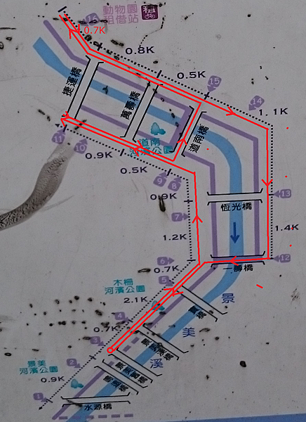 但事實是先到水源橋(三叉路),往北繼續一小段才有景美溪右岸8.0KM。